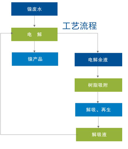 含镍废水的回收处理采用的是旋转电解—树脂吸附工艺,废液镍液先电解后吸附,电解可99.9以上的金属银或镍产品;当废液中金属含量降低至0.5g/L以下时再采用离子吸附处理,终将废液中的金属离子浓度降到1mg以下。